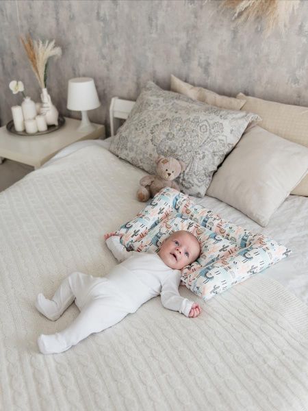 Удобная подушечка создана специально для маленьких детишек. Она легкая и приятная. Валики с трех сторон выполнены для дополнительной поддержки. Боковые «валики» позволяют фиксировать головку на подушечке во время сна или бодрствования, третий валик бережно поддержит шею для правильного развития.